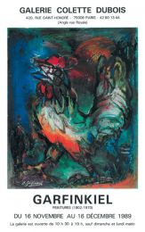 Garfinkiel reconnaît qu’il dessine au pinceau et peint par touches visibles, translucides, libres et denses. Quelques fois, sa matière rappelle la mosaïque (…). L’œuvre peinte de Garfinkiel, ce discret visionnaire, est une œuvre à double polarité. Elle comprend, d’une part, une suite de toiles qui trouvent en elles-mêmes leur intime raison d’être. Les poissons aux écailles oxydées,,, les roses épanouies qui mûrissent dans un vase et les jeunes filles diaphanes aux jupons chamarrés, comme ceux des Algériennes d’Eugène Delacroix, n’ont d’autre fin que la délectation.